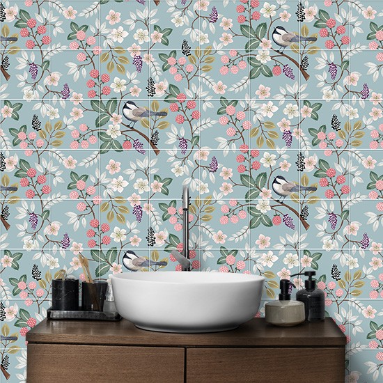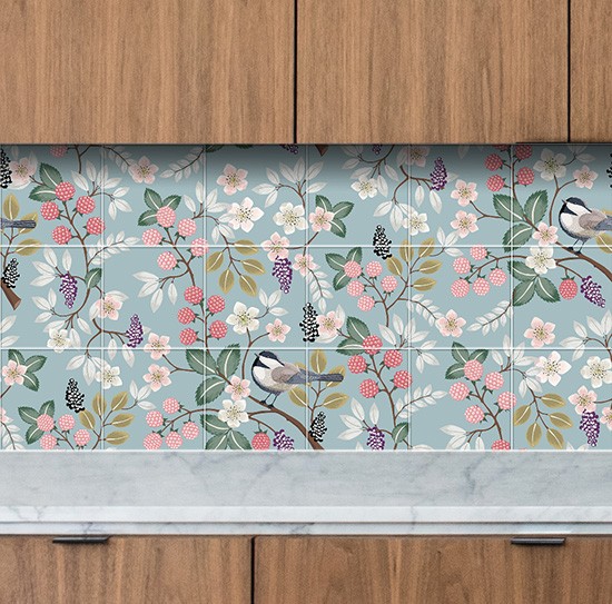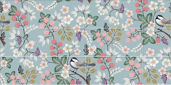 This decorative tile mural features small birds perched on flowering branches, surrounded by detailed raspberries, blackberries, and delicate blossoms. The soft blue background adds calmness to the composition, making it an excellent decorative tile choice for vintage or romantic-style kitchens. The carefully arranged botanical and animal motifs bring a peaceful, natural touch to any interior space where ambiance matters.