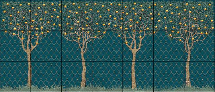 This elegant ceramic tile mural showcases a row of stylized orange trees, each with delicate trunks and richly leafed canopies filled with golden oranges. The emerald green background features a geometric trellis pattern that enhances the refined symmetry and graphic rhythm of the scene. The composition blends nature and structure, creating a serene yet vibrant decorative element.