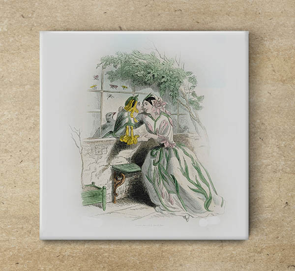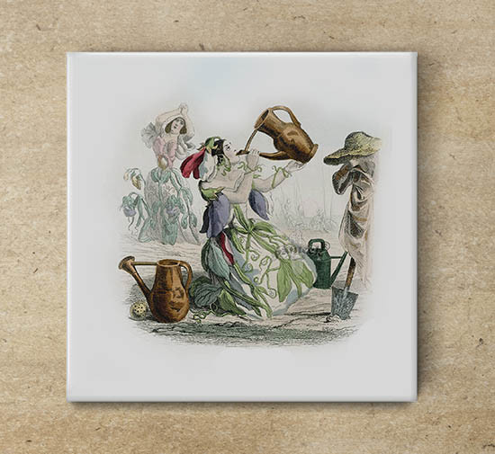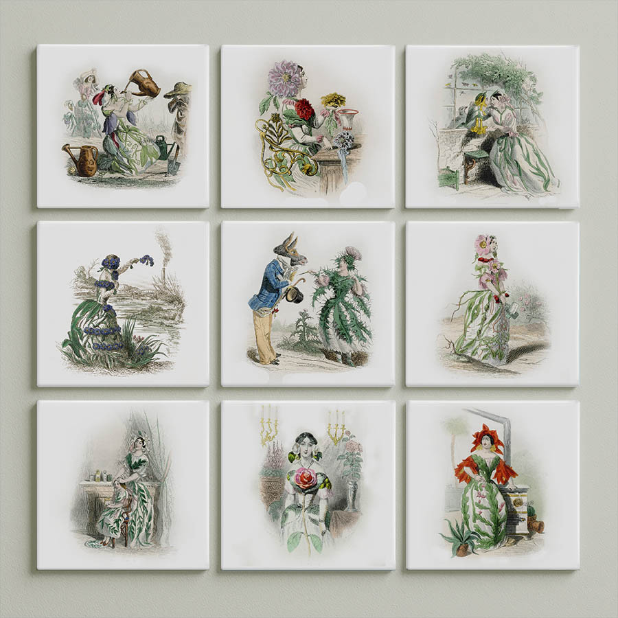 Flower fairies (by Jean Ignac Gerard Grandville) 9 pcs of tiles with different fairy on each tile. (forgetmenot, dahlia, cactus etc.).