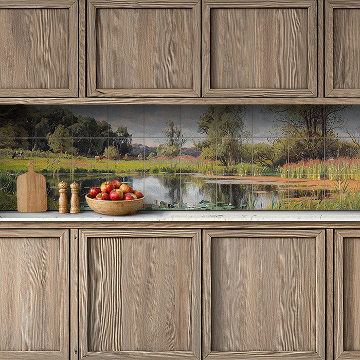 This painting-style ceramic tile mural displays a peaceful summer scene by a lake. Tall trees, lush grasses and blooming water lilies frame the still water that mirrors the sky and landscape. Rolling hills and a distant meadow complete the tranquil countryside atmosphere. Ideal as a decorative tile mural for bathrooms, wellness areas, or rustic interior spaces.