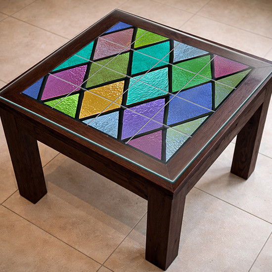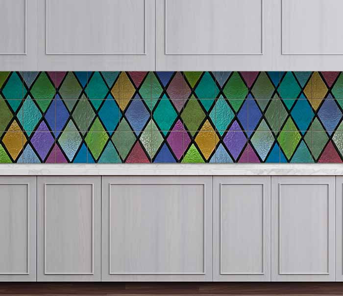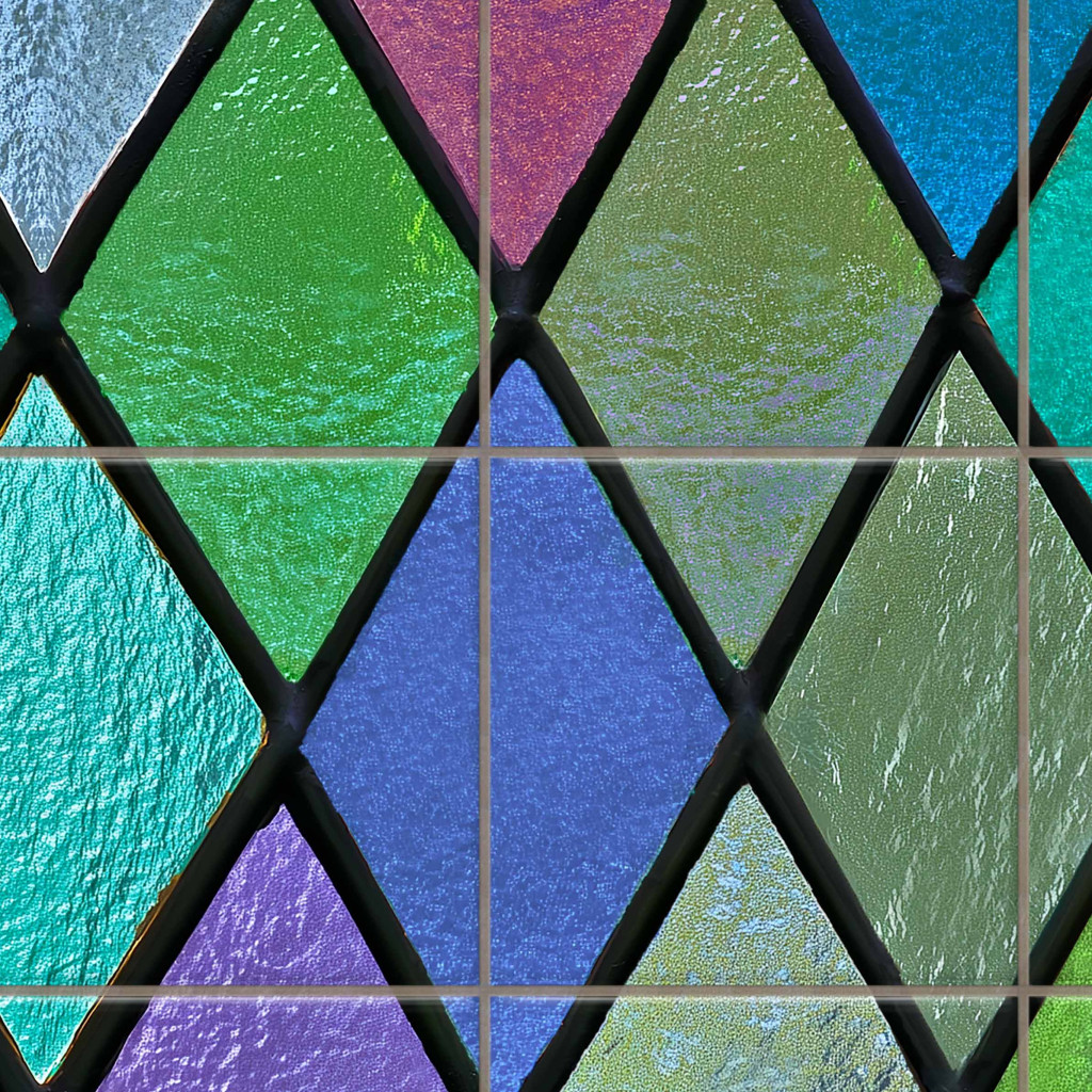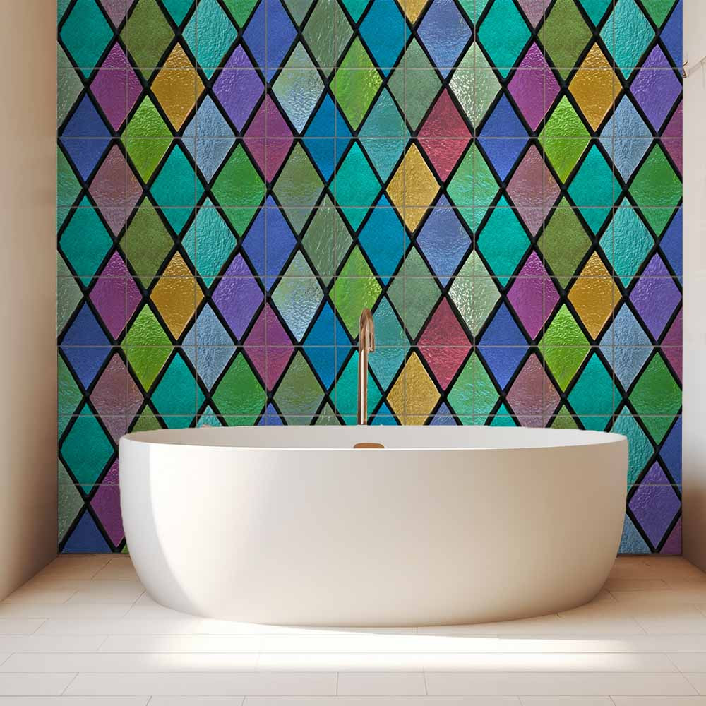 This stunning tile mural evokes the charm of stained glass with a bold, geometric twist. The design features vivid diamond shapes in a vibrant palette of colors – purple, yellow, turquoise, green, blue, pink, orange and gold – arranged in a rhythmic, harmonious composition.