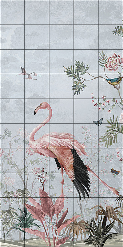Delicate ceramic tile mural with flamingos, tropical plants, and birds – a graceful addition to any nature-inspired interior.