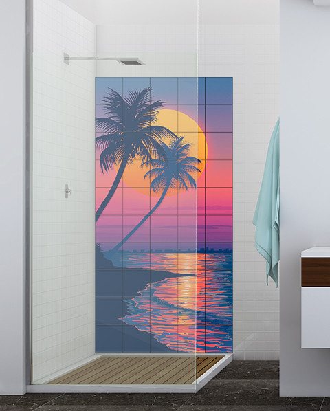 This decorative tile mural captures the retro Miami Vice vibe with bold contrasts and rich colors. A glowing orange sun dominates the scene, flanked by the dramatic silhouettes of palm trees. The sky melts into vivid pinks and purples, while the shimmering water and curved shoreline create a serene yet dynamic composition.