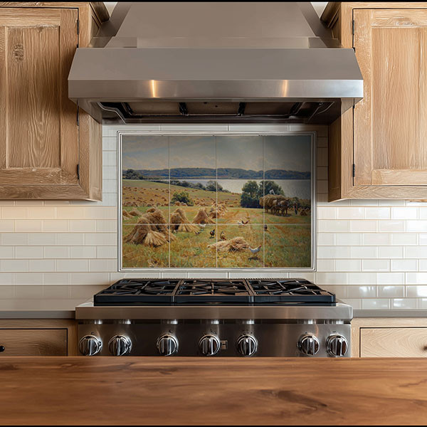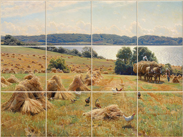 This classic rural scene is presented as a ceramic tile mural, based on the artwork of Peter Mork Mønsted. It captures a peaceful countryside moment: scattered hay sheaves after harvest, free-roaming chickens, and a horse-drawn cart being loaded by farmers. The background features a calm lake and forested hills under a soft, clouded sky. The composition is both realistic and serene, making this tile mural a refined decorative choice for rustic kitchens, farmhouse dining rooms, or wall art lovers seeking tranquility in their interiors.