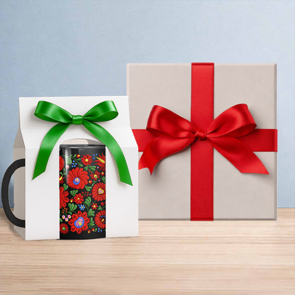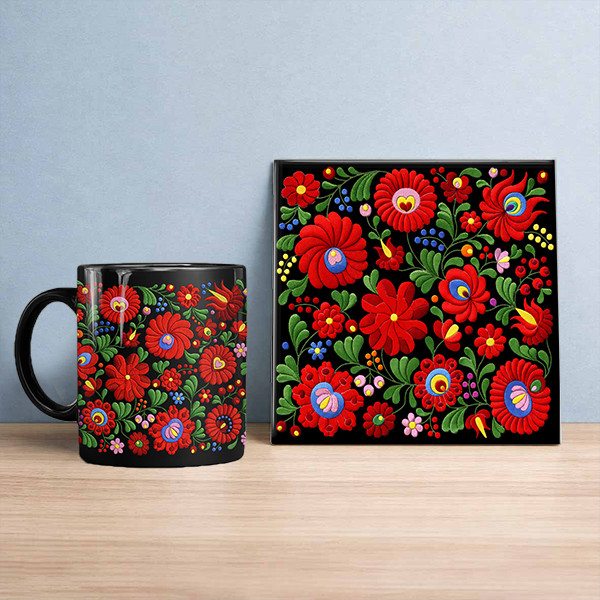 This ceramic trivet tile and mug feature the classic Matyó folk pattern, decorated with vibrant red floral motifs. The composition combines characteristic elements of traditional Hungarian folk art with a clean, modern appearance.
