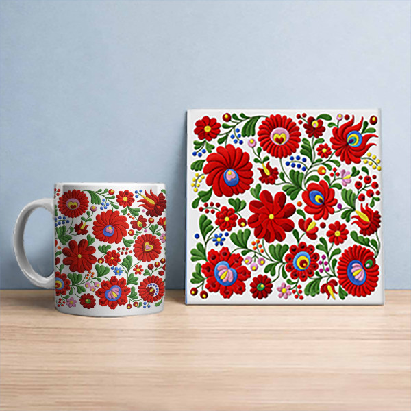 This ceramic trivet tile and mug feature the classic Matyó folk pattern, decorated with vibrant red floral motifs. The composition combines characteristic elements of traditional Hungarian folk art with a clean, modern appearance.