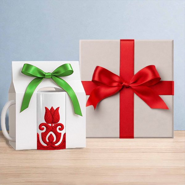 This ceramic trivet tile and mug feature the classic Transylvanian tulip folk pattern, decorated with vibrant red tulip motifs. The composition combines characteristic elements of traditional Hungarian folk art with a clean, modern appearance.