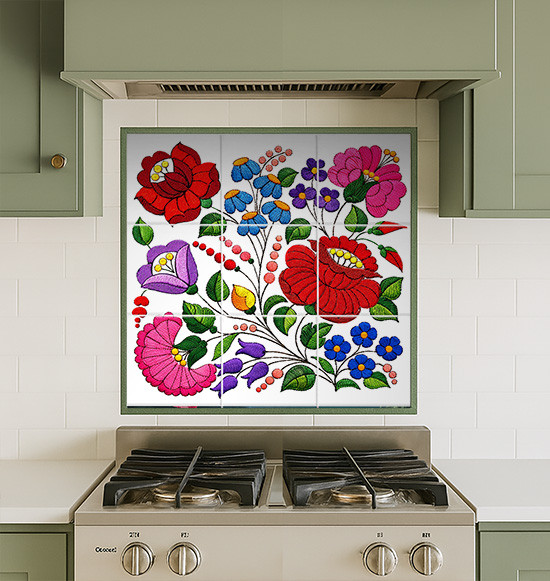 Colorful decorative tile featuring traditional Kalocsa embroidery floral motifs. Ideal for folk, rustic or heritage-style interiors.