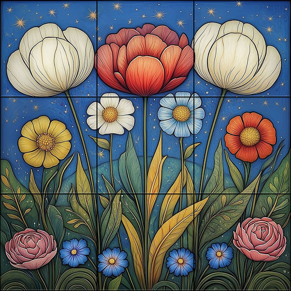 Decorative ceramic tile mural featuring stylized poppies, daisies, forget-me-nots, and roses, set against a starry night backdrop. Please select a size!