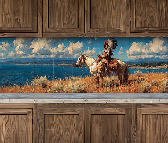 This ceramic tile mural features a Native American man in traditional dress sitting on horseback, gazing across a tranquil lake surrounded by golden grasses. The wide-open plains and dramatic sky with fluffy clouds evoke the spirit of the American West. This unique tile mural is a perfect decorative tile choice for rustic interiors, themed restaurants, or anyone seeking nature-inspired wall decor.