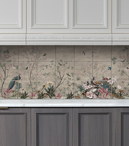 Elegant ceramic tile mural depicting peacocks, butterflies, tropical birds, blooming branches, peonies, and exotic plants in a classic illustrated composition.
