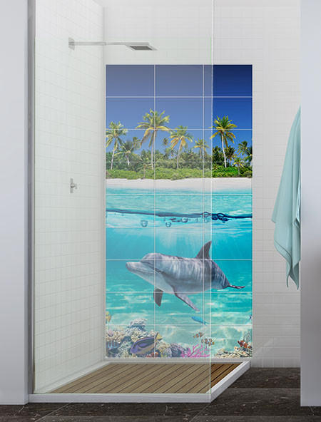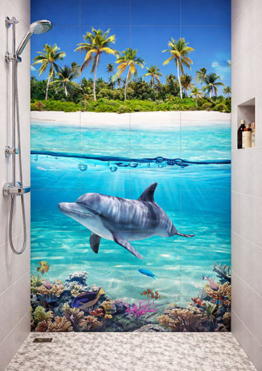 Tropical bathroom tile mural featuring a dolphin, a coral reef, and a palm-covered island. Striking tile mural with underwater and seascape details.