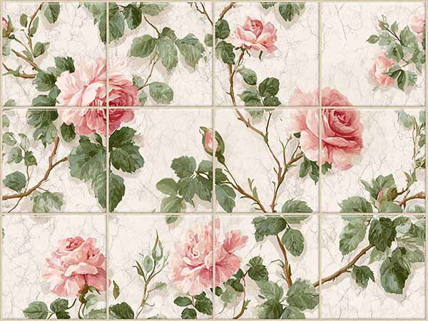 This romantic ceramic tile mural is composed of multiple tiles arranged in a mosaic style, showcasing hand-painted style pink roses and detailed green foliage. The subtle marbled background enhances the floral design, making it suitable for elegant, classic, or vintage-inspired bathrooms, kitchens, or cozy interiors. The overall effect is refined and timeless.
