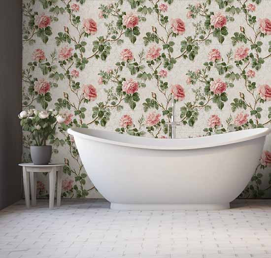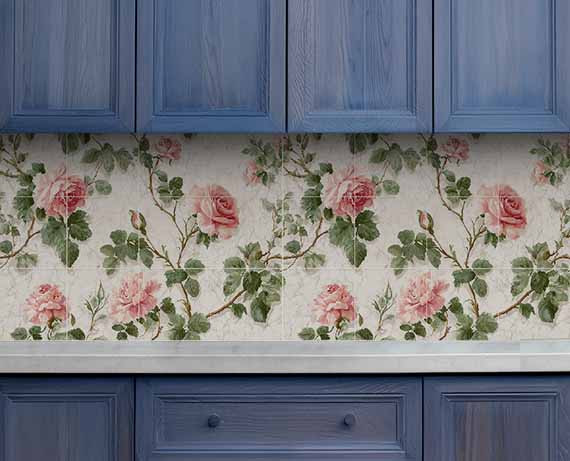 Classic-style tile mural featuring pink roses and green leaves on a soft marbled background. A romantic ceramic tile mural for vintage interiors.
