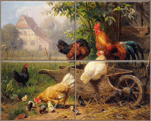 Rustic tile mural depicting a countryside poultry yard with a rooster, hens, and chicks. Nostalgic rural-themed ceramic tile mural.