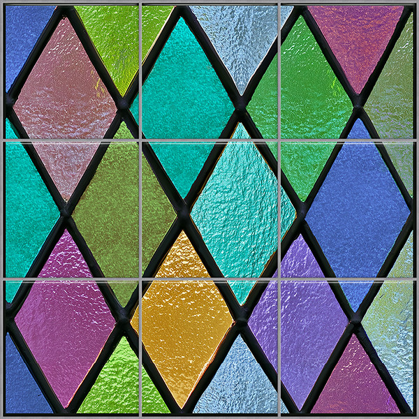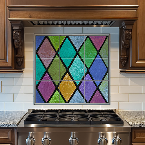 This stunning tile mural evokes the charm of stained glass with a bold, geometric twist. The design features vivid diamond shapes in a vibrant palette of colors – purple, yellow, turquoise, green, blue, pink, orange and gold – arranged in a rhythmic, harmonious composition.