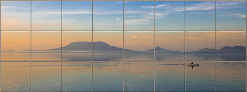 This ceramic tile mural presents a panoramic view of Lake Balaton with the iconic shape of Badacsony mountain, a lone rowing boat, and reflections of the sunset on the still surface. The natural tones and peaceful mood make it a refined wall decoration for interiors like bathrooms, wellness areas. This Balaton-themed tile mural blends well into both modern and rustic designs.