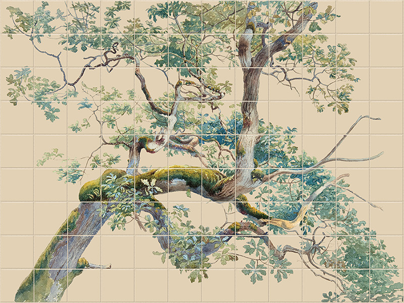 This tile mural presents a botanical scene with intricately detailed tree branches, moss-covered limbs, and a rich canopy of leaves. The delicate, hand-painted style creates a calming and elegant visual impact. Ideal for use in classic or rustic interiors, kitchens, or bathrooms. The composition evokes a serene, timeless atmosphere and brings natural beauty indoors. This ceramic tile mural is perfect for those who seek harmony between art and nature in their interior design.