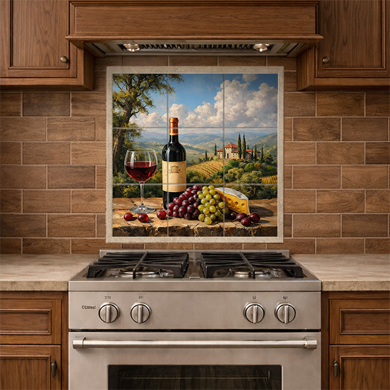 Bring the charm of Tuscany into your home with this elegant mosaic wall tile featuring a classic Italian countryside landscape. A bottle of red wine and a filled wine glass rest on a rustic stone ledge, accompanied by a bunch of red and green grapes, cherries, and a generous slice of cheese. In the distance, you’ll spot a charming Tuscan villa nestled among the vineyards and rolling hills, with tall cypress trees accenting the horizon and a radiant blue sky filled with fluffy clouds.