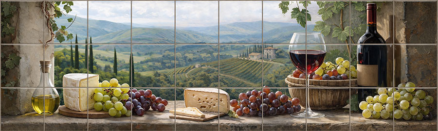 Tuscany still life tile mural backsplash. Wine, cheese, grapes.