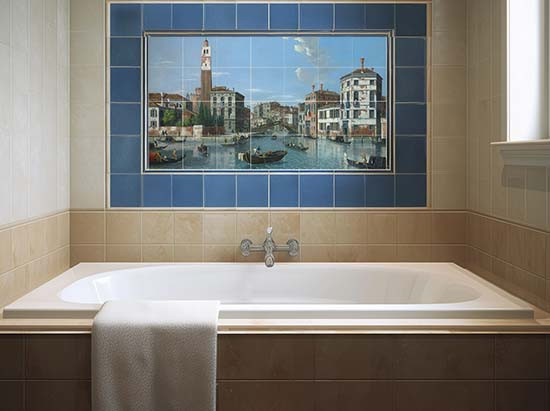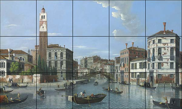 Inspired by Canaletto’s timeless style, this detailed tile mural depicts a vibrant scene from Venice’s Grand Canal. In the center, a graceful stone bridge spans the canal, under which several gondolas glide through the calm waters. The composition features a majestic bell tower, elegant Renaissance-style buildings, and bustling daily life, evoking the romance and history of Venice.