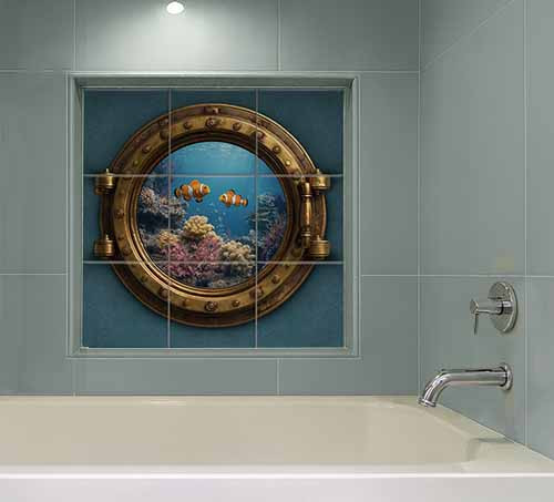 Submarine porthole-style decorative tile mural featuring clownfish and coral reef. Eye-catching, depth-effect wall tile for bathrooms and themed interiors.