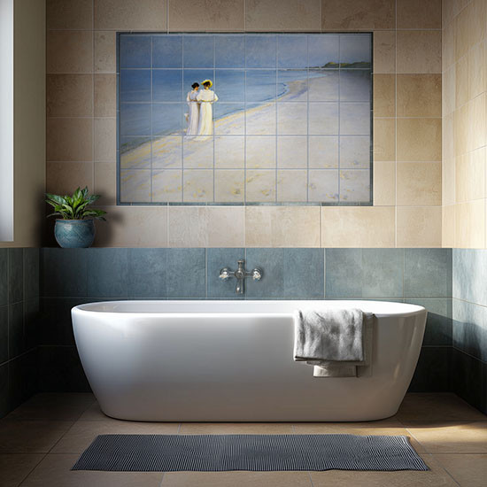 This elegant tile mural features a scene inspired by Peder Severin Krøyer’s 1893 painting, portraying two women in white dresses walking arm-in-arm along the Danish Skagen shoreline. The soft hues of the sea, sand, and sky evoke a tranquil and timeless atmosphere. This classic ceramic tile mural is ideal for serene interior spaces such as bathrooms, bedrooms, or coastal-themed rooms where a gentle, reflective mood is desired.