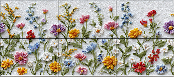 This decorative tile mural features a rich variety of wildflowers, including poppies, cornflowers, daisies, yellow blossoms, and purple meadow flowers. The arrangement mimics a natural meadow with flowing stems and varied colors set against a clean white background. Assembled from multiple ceramic tiles, this tile mural creates a vivid and refreshing effect, ideal for kitchens, bathrooms, or rustic holiday interiors. The design is horizontally extendable, making it suitable for larger wall surfaces.