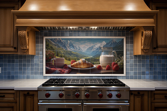 This beautiful tile mural captures a tranquil morning in the French Alps. In the foreground, a plate with a fresh croissant and ripe strawberries sits beside a classic jug filled with milk. Beyond, sunlit alpine meadows, tall pine trees, and majestic snow-capped peaks stretch into the horizon. A bright blue sky and soft clouds, adding to the idyllic charm.