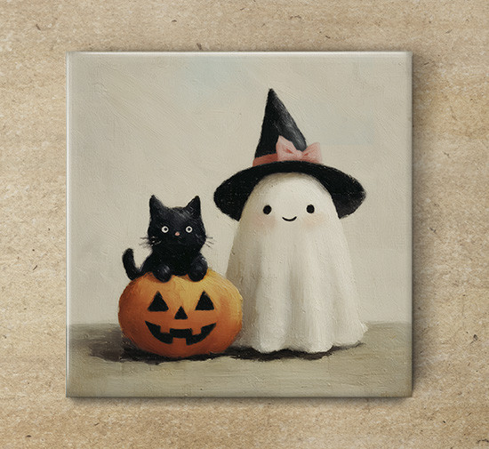 Halloween ghost ceramic tile trivet with black cat and pumpkin.