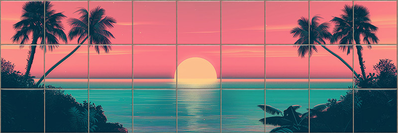 Ceramic tile mural with silhouetted palm trees and vibrant sunset – add a touch of Miami Vice to your interior walls.