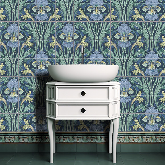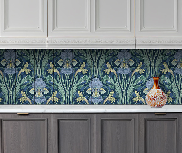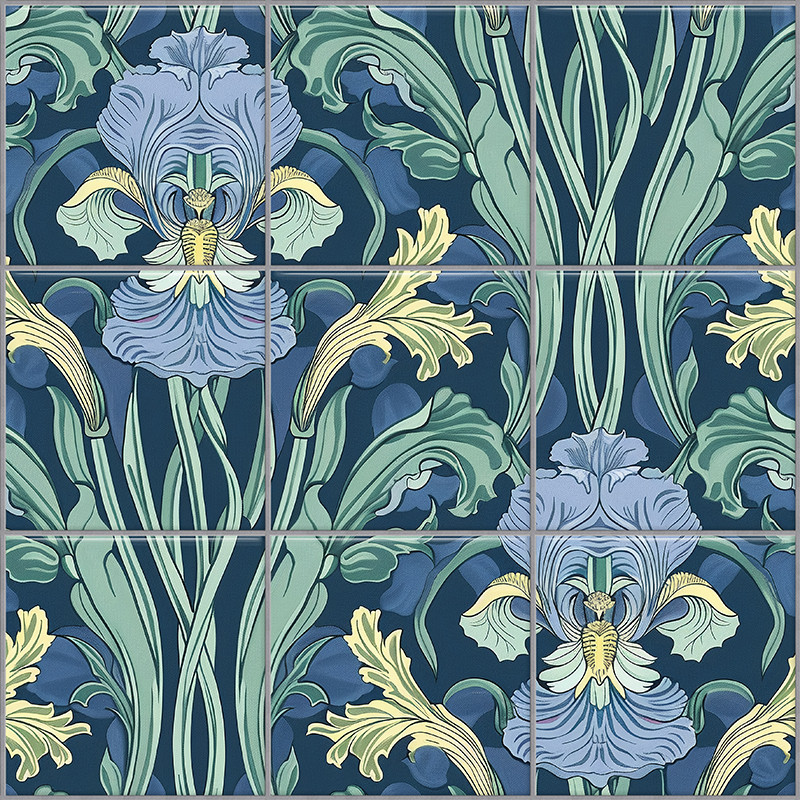 Art nouveau-inspired tile mural with stylized iris flowers, flowing leaves, and a deep blue background. A classic ceramic tile mural for elegant interiors.