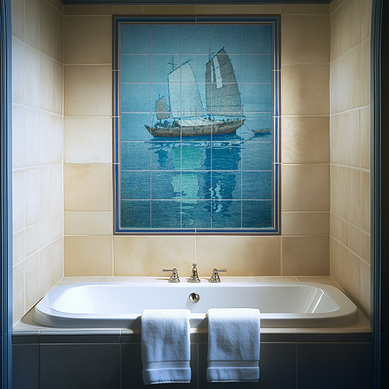 Vitorláshajó és csónak mintás kék alapszínű fürdőszoba csempe