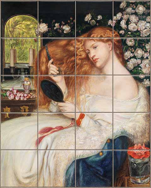 This elegant tile mural presents a refined pre-Raphaelite scene featuring a young woman with long red hair, combing it while holding a hand mirror. The background includes blooming rose bushes, a soft garden view through a window, and an antique table with flowers, a candleholder, and a teacup. The composition reflects timeless beauty and classic femininity, making it ideal for vintage, romantic interiors. This ceramic tile mural adds a sophisticated decorative touch to living spaces, salons, or bathrooms.