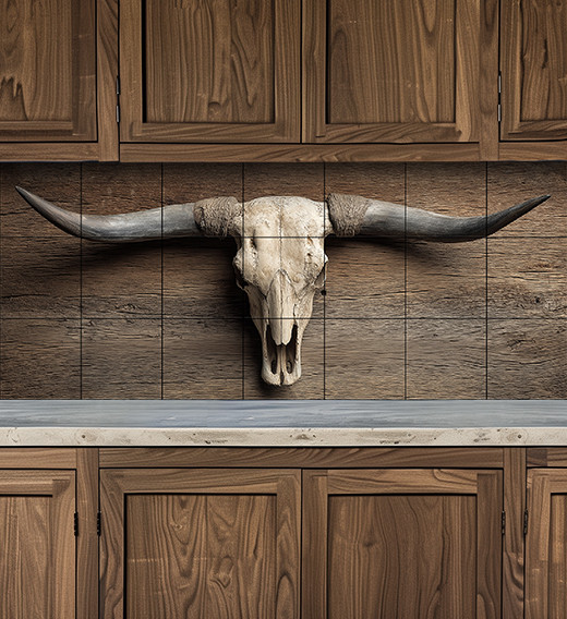 This striking tile mural presents a detailed longhorn skull set against a textured wood background, evoking a strong rustic and western aesthetic. The long horns extend gracefully across the composition, creating visual balance and strength. The combination of natural elements and bold imagery makes this ceramic tile mural a perfect centerpiece in masculine, country, or southwestern-themed interiors.