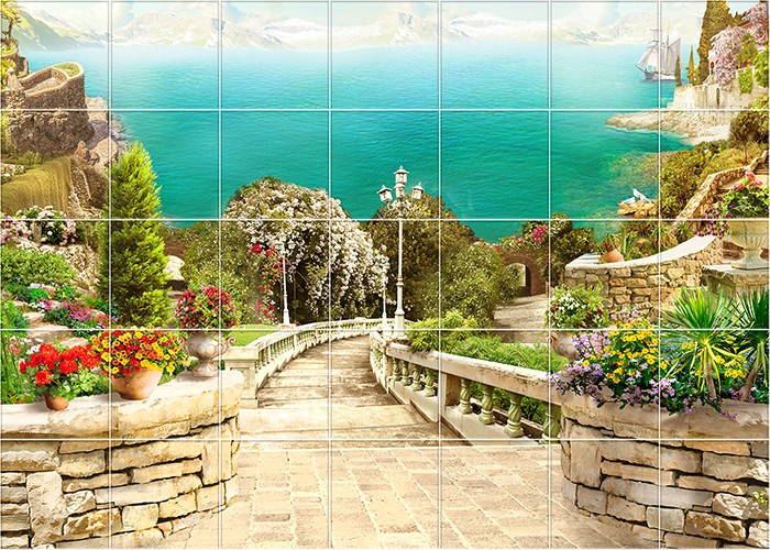Ceramic tile mural featuring a decorative stone staircase, flower-filled terrace and panoramic sea view.