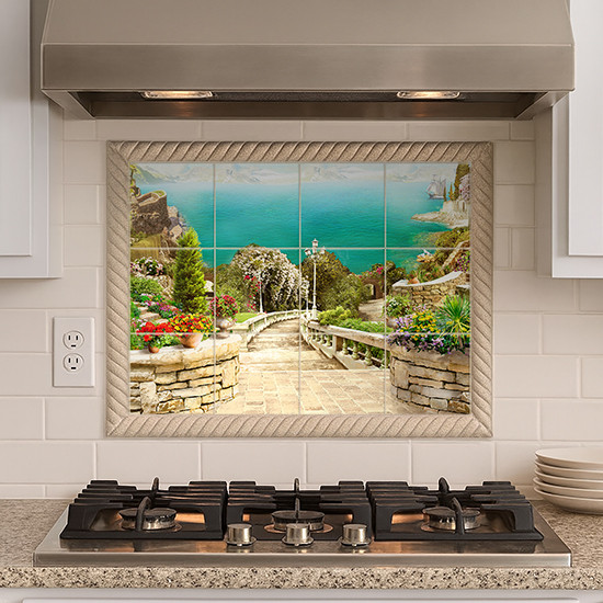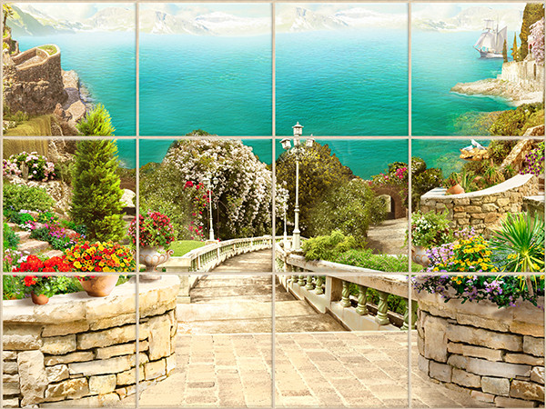 This vibrant tile mural depicts a charming Mediterranean garden terrace leading down to the turquoise sea via an elegant stone staircase. Framed by antique balustrades, the stairs are flanked by blooming flower pots, lush shrubs, and perfectly trimmed cypress and pine trees. In the distance, a rocky coastline, serene blue sky, and a vintage lamppost complete the tranquil scene. A perfect combination of natural beauty and classical architecture, this mural radiates warmth and elegance.