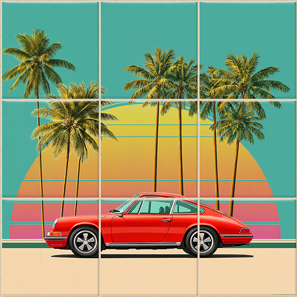 This decorative tile mural captures the retro Miami Vice vibe with bold contrasts and rich colors. A glowing orange sun dominates the scene, flanked by palm trees. A red Porsche 911 car in the center.