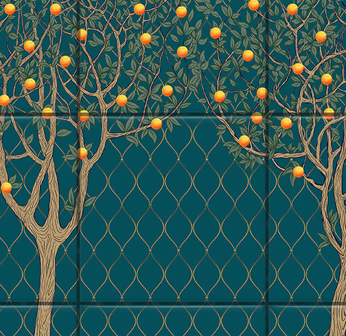 Minimalist-style ceramic tile mural featuring stylized orange trees with a dark green trellis background.