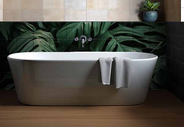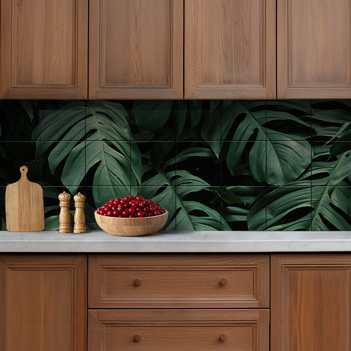 This visually striking ceramic tile mural showcases lush, overlapping monstera leaves in deep green tones, evoking the ambiance of a dense tropical forest. The rich foliage creates a calming, natural aesthetic ideal for modern interiors. The mural works especially well in bathrooms, wellness areas, or green-themed kitchens where natural motifs are preferred. A bold and organic tile mural choice for indoor decoration.
