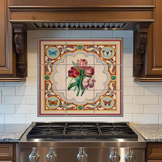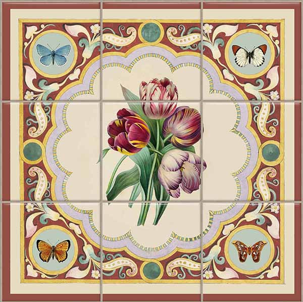 This elegant tile mural presents a vivid central tulip bouquet, framed symmetrically by four beautifully rendered butterflies and ornate decorative elements. The background features curved patterns and soft color transitions. Perfect as a decorative ceramic tile mural in classic, romantic, or vintage-inspired interiors.