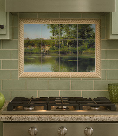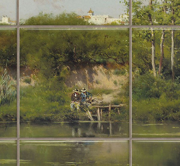 Nature-inspired tile mural with a riverbank, trees, and men fishing.