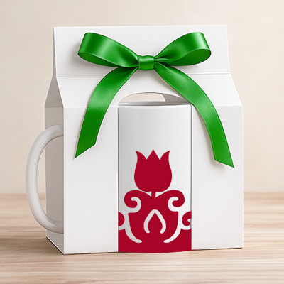 Saját tervezésű magyar népi mintákkal díszített porcelán bögre. A termékhez kérhető fehér alapszínű díszdoboz zöld szalaggal. A szalag átkötése és a doboz kialakítása vizuálisan kiadja a piros–fehér–zöld nemzeti színkombinációt, így az ajándékcsomagolás önmagában is erős magyar identitású megjelenést biztosít.