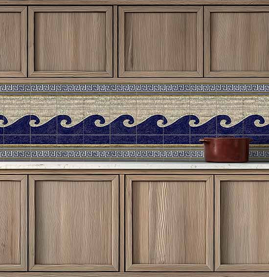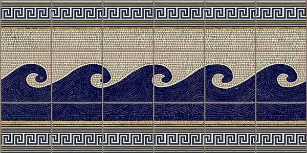 Ez a klasszikus hatású dekorcsempe kompozíció az ókori görög művészetet idézi meg. A központi motívumot sötétkék, stilizált hullámok adják, amelyek világos mozaikos háttér előtt futnak végig. A kép felső és alsó részét geometrikus, görög kulcsminta szegély díszíti, amely erősíti az antik hangulatot. Ez a csempekép letisztult és időtlen dekorációként illeszkedik belső terekbe, a klasszikus mediterrán stílus kedvelőinek.