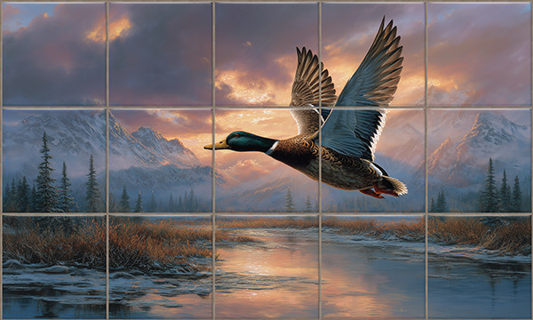 Természetközeli hangulatú dekorcsempe, repülő vadkacsa ábrázolással hegyvidéki táj felett.