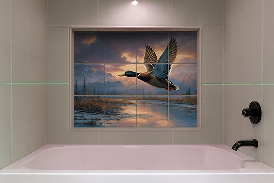 Repülő vadkacsát ábrázoló dekorcsempe hegyvidéki tájjal
