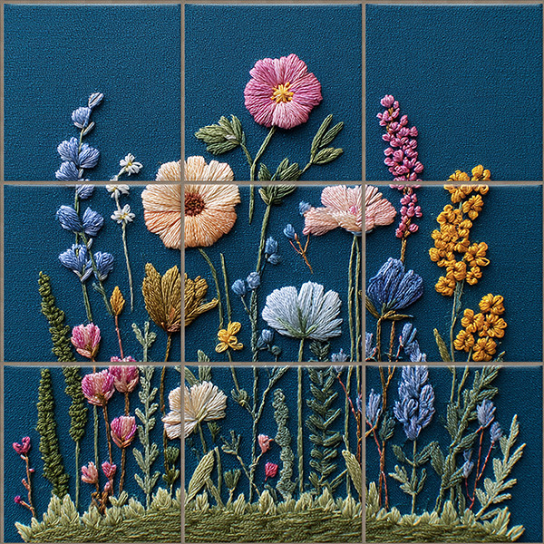 Különleges megjelenésű dekorcsempe, amely hímzett hatású vadvirág kompozíciót ábrázol sötétkék háttéren. A finoman kidolgozott virágmotívumok és a textilszerű struktúra látványos, kézműves hangulatot kölcsönöz a felületnek.