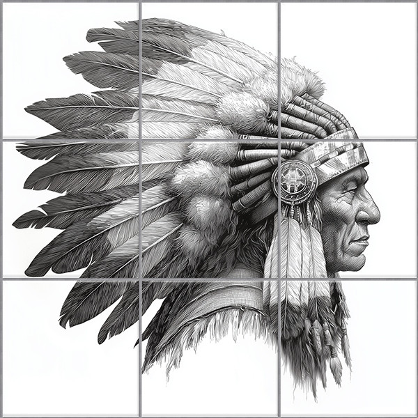 Fekete-fehér stílusú dekorcsempe tollas fejdíszt viselő amerikai indián férfi portréjával.