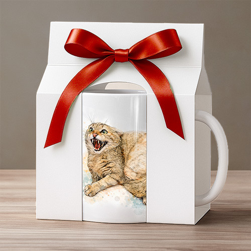 A vecsési Cica-Vár-Lak Alapítvány által 2024-ben mentett vadmacskát ábrázoló kerámia bögre.