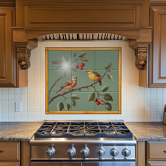 Ez a természetes hangulatú csempekép két színes madarat ábrázol, akik egy cseresznyefa ágán ülnek. A madarak tollazata, valamint a pirosló cseresznyék és zöld levelek elegáns, klasszikus hatást keltenek. A kép zöld háttere kiemeli a motívumokat, így harmonikusan illeszkedik romantikus, klasszikus vagy vidéki enteriőrökbe. A dekoráció több kerámia alapcsempéből épül fel mozaikszerűen. Kiváló választás konyhai hátfalra, fürdőszobai falfelületre vagy bútorfront díszítésére is.